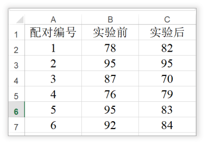 - 配对样本T检验的数据格式与上文提到的独立样本T检验不同,两组配对数据需要分别成一列,具体参考下图: