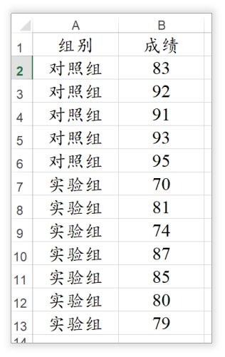 - 在进行分析前,首先确保分析软件要求的数据格式正确,例如部分软件要求将进行对比的两组数据放在同一列中,同时有一列用来表示数据的组别,正确格式如下: