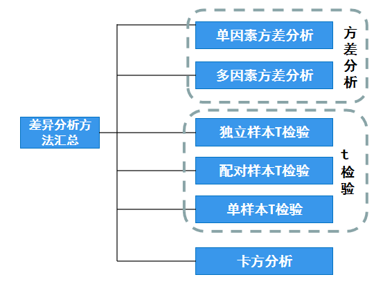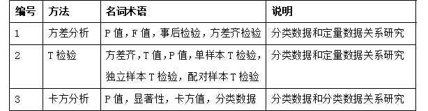 在日常的研究中,差异研究涉及以下三类方法,分别是方差分析,T检验和卡方分析,涉及相关术语名词汇总如下表。[5]