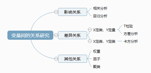变量间的关系,大致可以分为三类:影响关系、差异关系和其他关系(比如聚类、因子等)[5]。通过确认数据间的关系情况,再加上提前对数据类型的判断,可找出合理的数据研究方法。[2][8]