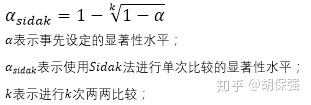 - Sidak校正在LSD法上的应用。通过Sidak校正降低每次两两比较的“弃真”错误概率,以使最终整个比较的“弃真”错误概率保持为显著性水平a。这也就是说每次比较的显著性水平a会随着比较次数的增多而减小。
