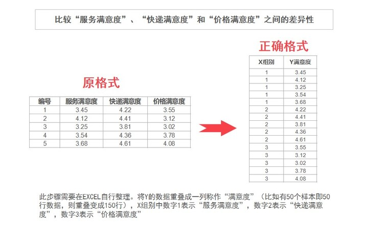 在分析前首先需要按分析软件要求的正确格式录入/上传才能得到有效的分析结果。例如针对方差分析,部分软件要求的正确的录入格式如下图所示[3]: